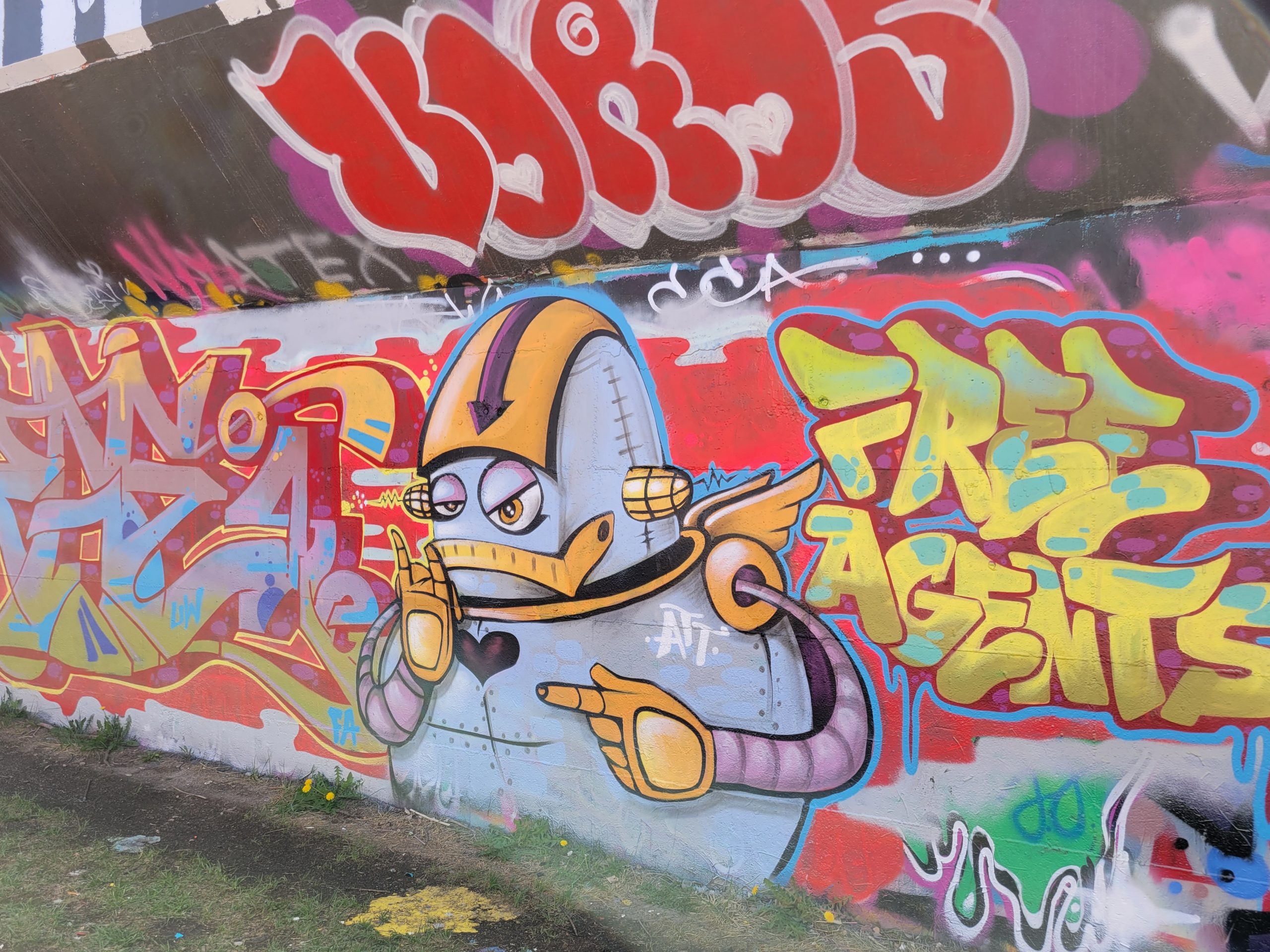 Painted along a concrete structure, this fun street art mural centers on an illustrative, light blue robot character. The retro-futuristic figure sports a yellow helmet accented with a purple arrow, small golden wings on its back, and a black heart on its chest. Depicted flashing a peace sign and pointing to the right, the robot stands beside large, glowing yellow and green bubble letters spelling out "FREE AGENTS". Surrounded by other colorful graffiti elements, including a large red "BIRD" throw-up above, this piece highlights the illustrative character work scattered throughout Denver's urban environment.