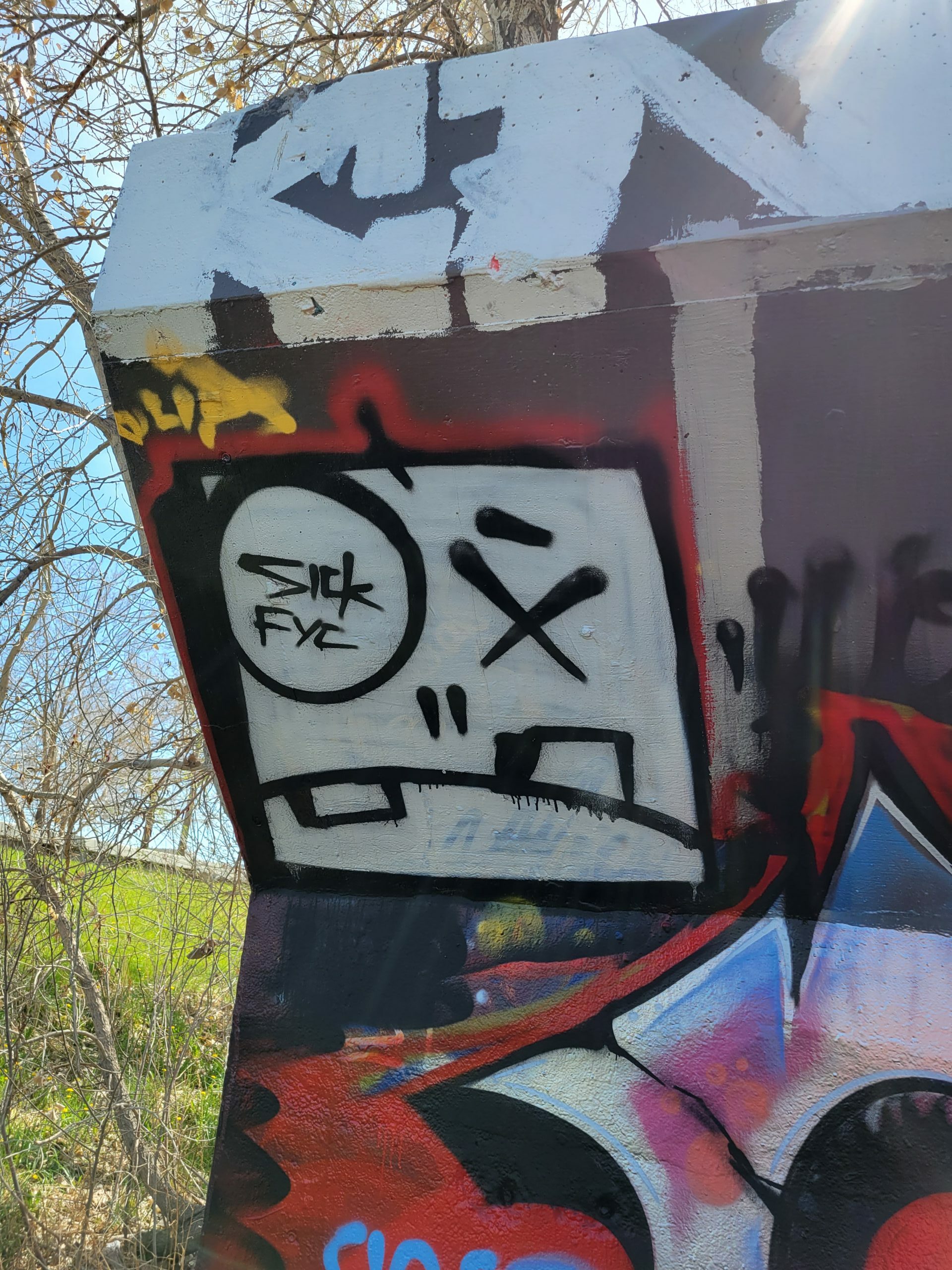 Painted on the angled edge of an outdoor concrete pillar, this distinctive black-and-white graffiti piece features a stylized, square face. The quirky character has a simple, blocky mouth, an "X" for its right eye, and a circular left eye containing the tag "SICK FYC". The minimalist, graphic design provides a striking contrast to the vibrant, colorful graffiti painted just below it and the sunny, natural backdrop of grass and trees.