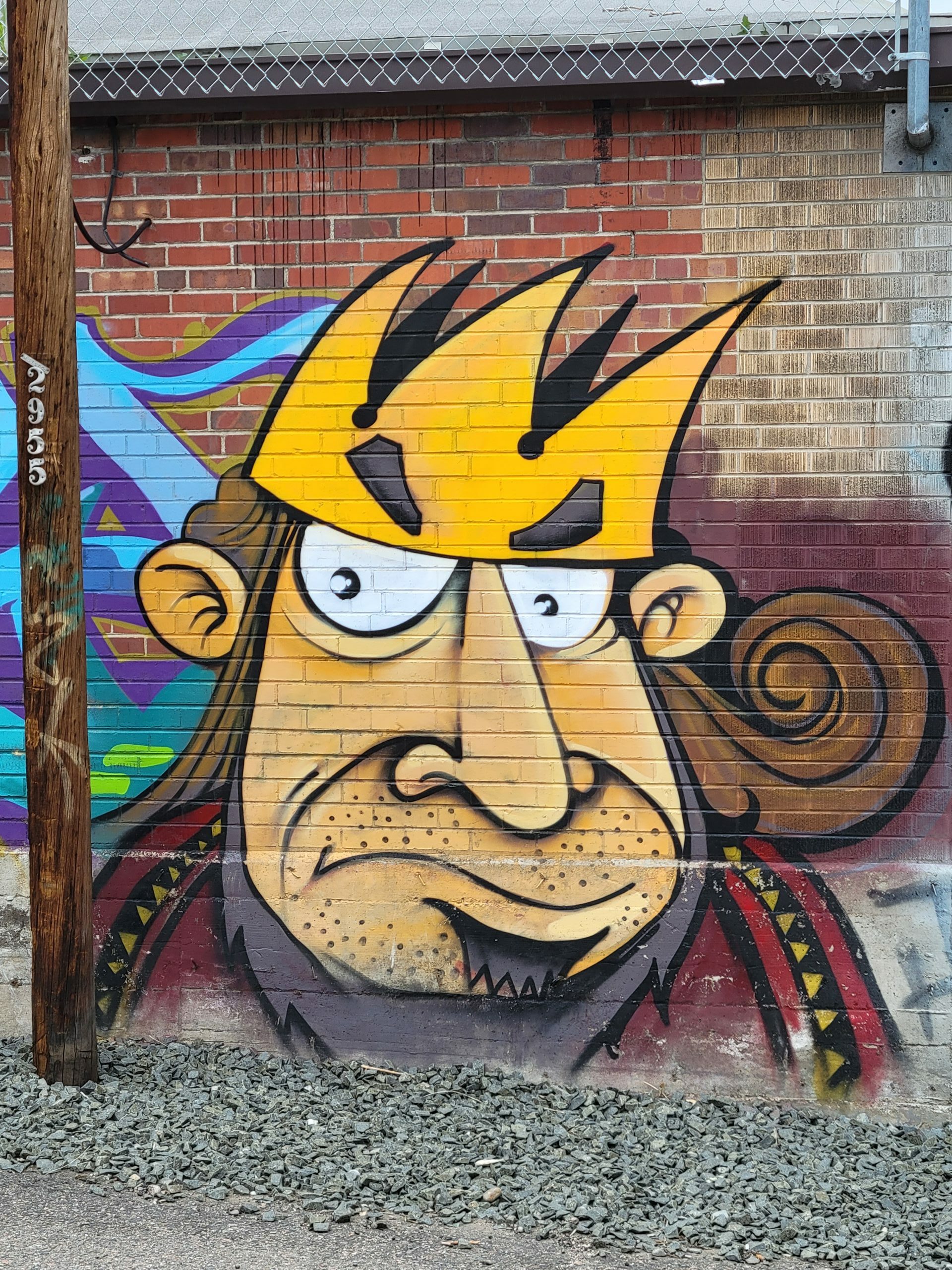 Painted directly onto a multi-colored brick facade, this fun street art piece features a large, cartoonish portrait of a man wearing a bright yellow, three-pointed crown. The character is designed with exaggerated, expressive features, including wide eyes, thick black eyebrows, a prominent nose, dotted stubble, and brown hair that curls up playfully on one side. Wearing a red and yellow patterned collar, the figure is framed by a weathered wooden utility pole on the left and a bed of grey gravel at the base, perfectly showcasing the whimsical side of Denver's urban art scene.