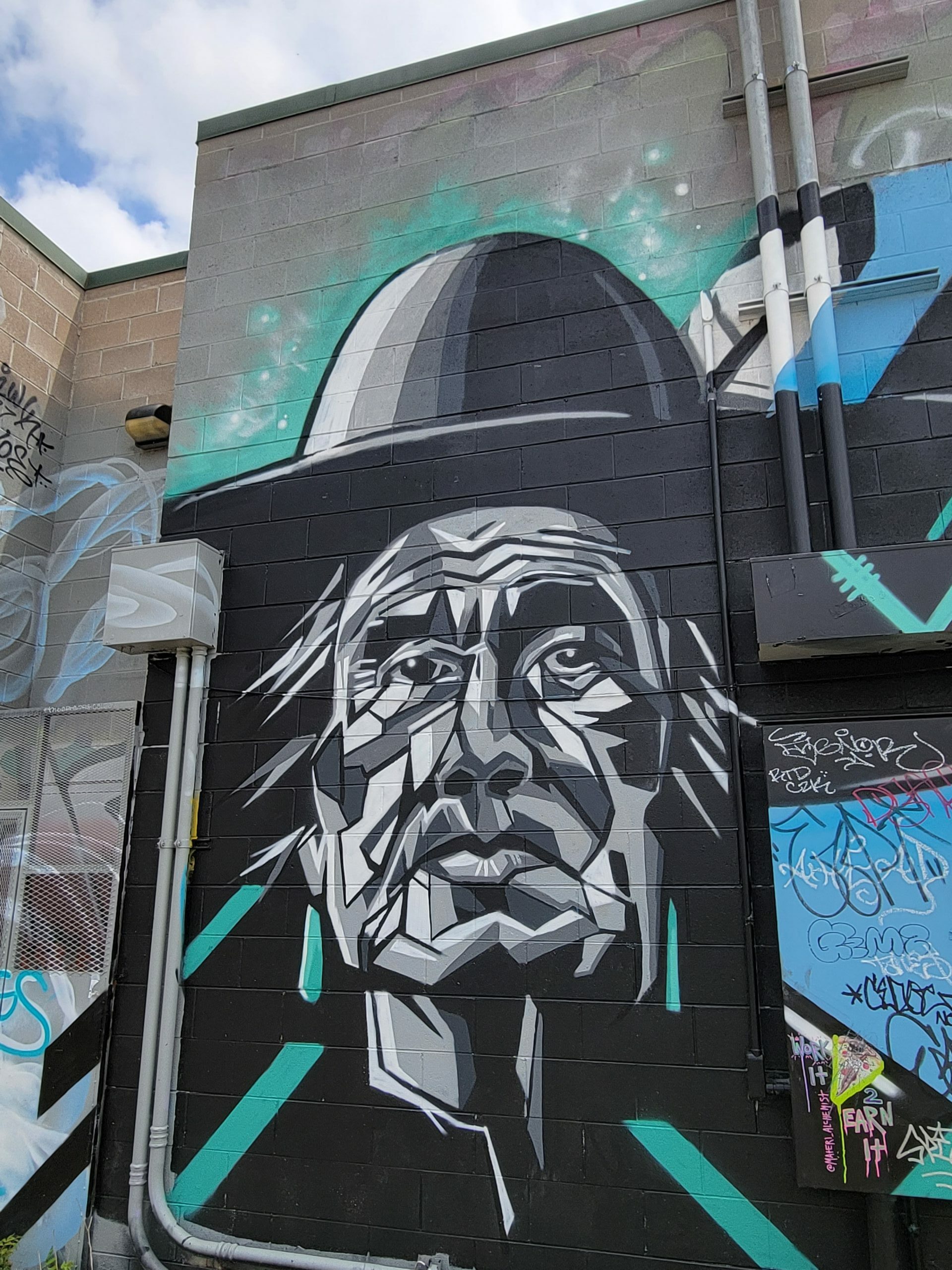 Painted on a tall black cinder block wall, this mural features a stylized portrait of an older man with a serious expression. The face is rendered in a unique "shattered" or geometric style, using various shades of grey and white blocks to create depth and texture. The figure wears a solid dark bowler hat and is accented by vibrant teal diagonal lines and a glowing teal aura near the top. Located in the same artistic corridor as the Venom and "Zero Ft Away" murals, this piece sits near various utility pipes and is surrounded by smaller colorful graffiti tags on the adjacent surfaces.