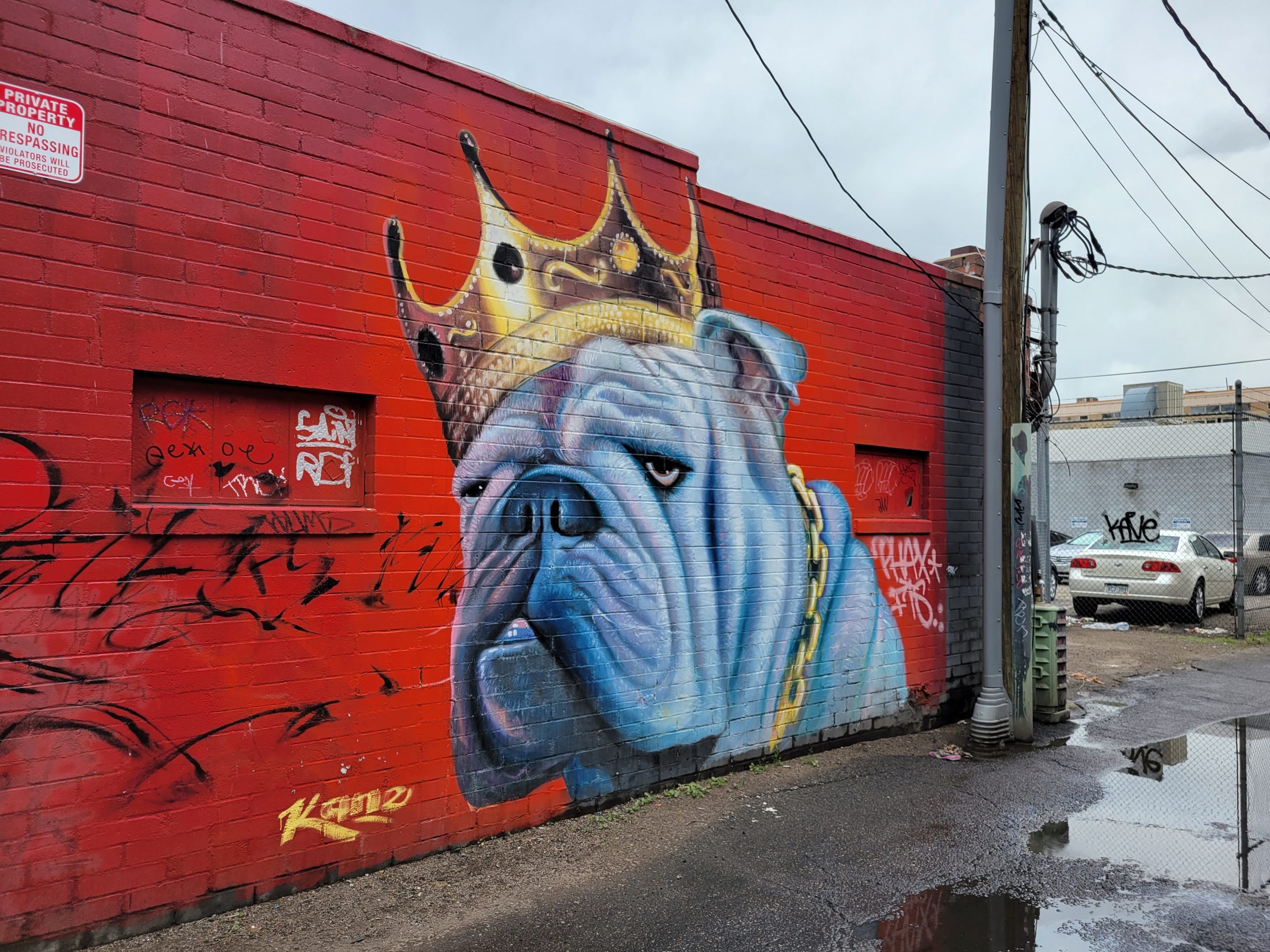 Painted on a bright red brick wall in a paved alley, this large-scale mural features a detailed portrait of an English Bulldog rendered in cool blue and white tones. The dog is depicted with a stoic expression, wearing a large, ornate gold crown decorated with jewels and a thick gold link chain around its neck. The background is a solid, vibrant red that makes the blue tones of the bulldog pop. To the left, a "Private Property" sign is visible, and the base of the wall features various gold and black graffiti tags, including one that reads "Kane". The scene is grounded by an urban alleyway featuring a utility pole and a puddle reflecting the surrounding architecture.