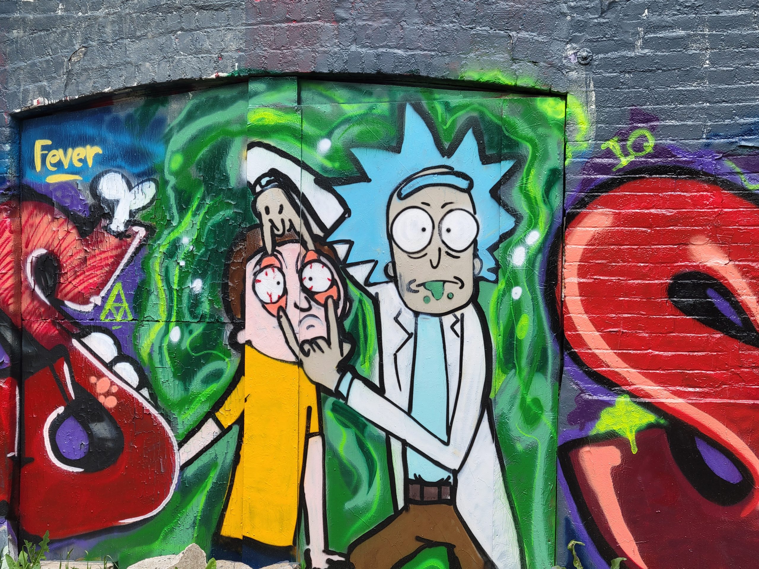 This close-up focuses on the central characters of a larger multi-story mural. The artwork depicts Rick Sanchez, complete with his signature unibrow and green drool, physically forcing Morty’s eyelids open to reveal small, red-veined pupils. The characters are outlined in bold black and set against a neon-green, gaseous vortex that mimics the show's portal aesthetic. The rough texture of the grey-painted brick wall adds a gritty, industrial feel to the otherwise bright and cartoonish pop-culture tribute.