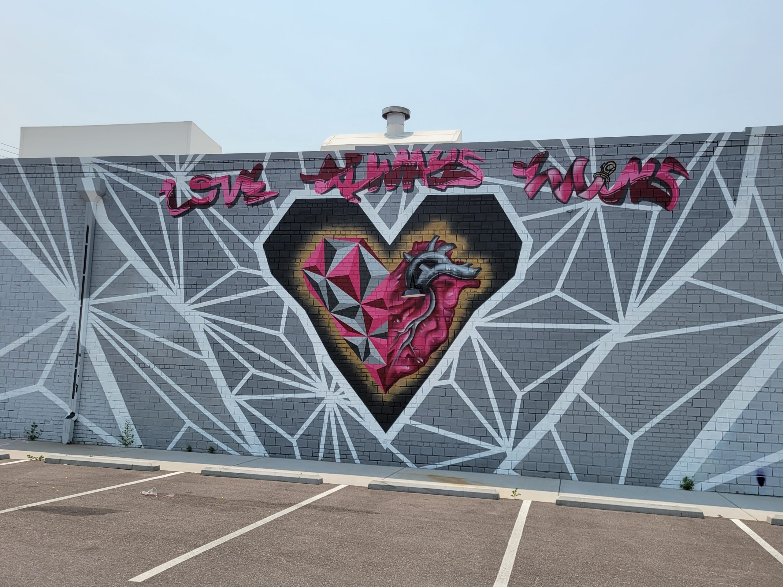 Painted on a long grey brick wall overlooking a parking lot, this mural features a large black heart silhouette as its centerpiece. The left side of the heart is filled with pink and grey 3D crystalline triangles, while the right side depicts a detailed, realistic anatomical heart in pink and grey tones. Above the heart, the phrase "LOVE ALWAYS WINS" is written in bold, stylized pink graffiti lettering. The entire composition is framed by an intricate web of white geometric lines that stretch across the wall, creating a shattered glass or crystalline effect. This piece sits on the same wall as the "Crystalline Fox," completing a cohesive and vibrant urban display.