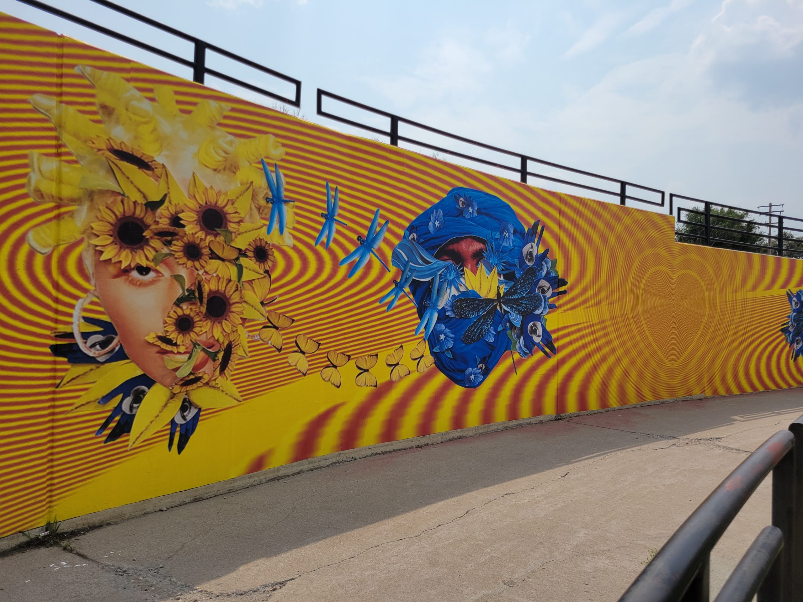 Painted on a long concrete wall beneath a metal handrail, this expansive mural features a background of dizzying, radial yellow and orange stripes. On the left, a realistic woman’s face is depicted with her eyes and hair replaced by an explosion of bright yellow sunflowers and blue floral accents. To her right, a line of yellow butterflies leads toward a second figure whose face is completely wrapped in a vibrant blue turban. This second figure is surrounded by large blue dragonflies and intricate blue butterflies, with a large black butterfly resting across the center. The artwork is located along a paved pedestrian path, adding a massive burst of color to the urban environment.