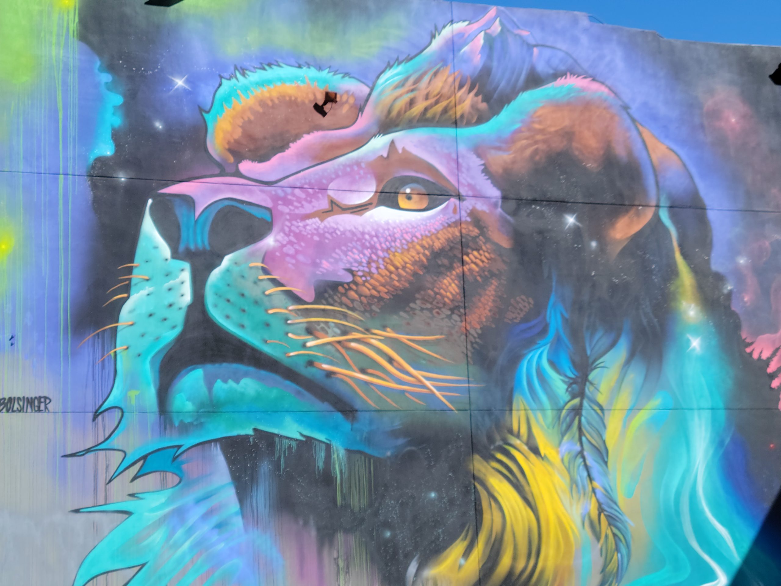 Painted on a large concrete wall, this piece depicts a majestic lion in profile, gazing upward. The lion's face is a tapestry of vivid colors: a teal muzzle with orange whiskers, pink and purple fur on the cheeks, and a soulful, amber eye. The mane is particularly striking, featuring flowing yellow and blue strands that look like a combination of feathers and cosmic energy, accented by small white stars and nebula-like clouds in the dark background. The artist's signature, "BOLSINGER," is visible in the bottom-left corner against a backdrop of dripping neon-green paint.