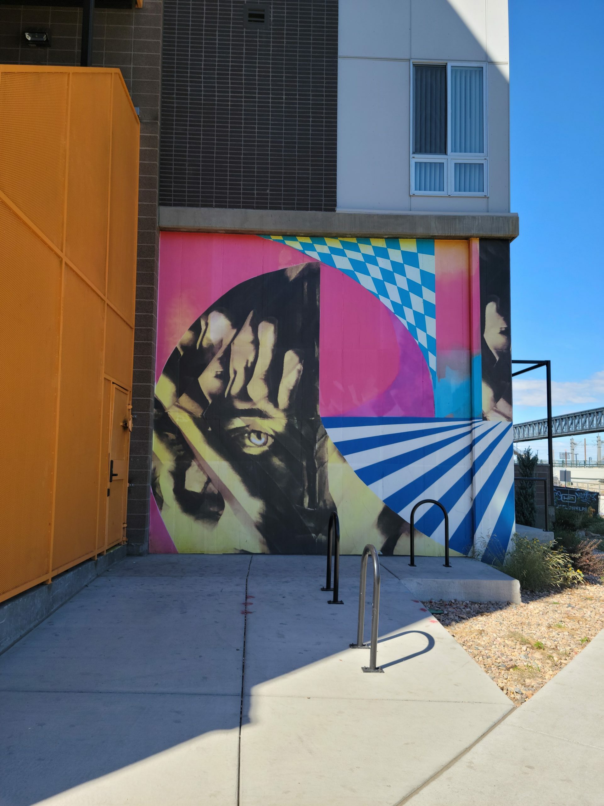 Painted in a recessed alcove of a modern building, this mural features a large-scale, monochromatic depiction of a person's eye and hands peeking through what looks like a torn surface. The portrait is overlaid with several distinct geometric elements: a large vibrant pink circle, a teal and white checkerboard pattern at the top, and a series of blue and white radiating lines at the bottom right. The artwork is situated next to a bright orange metal structure and a concrete walkway with bicycle racks, showcasing how Denver integrates high-contrast contemporary art into functional public spaces.