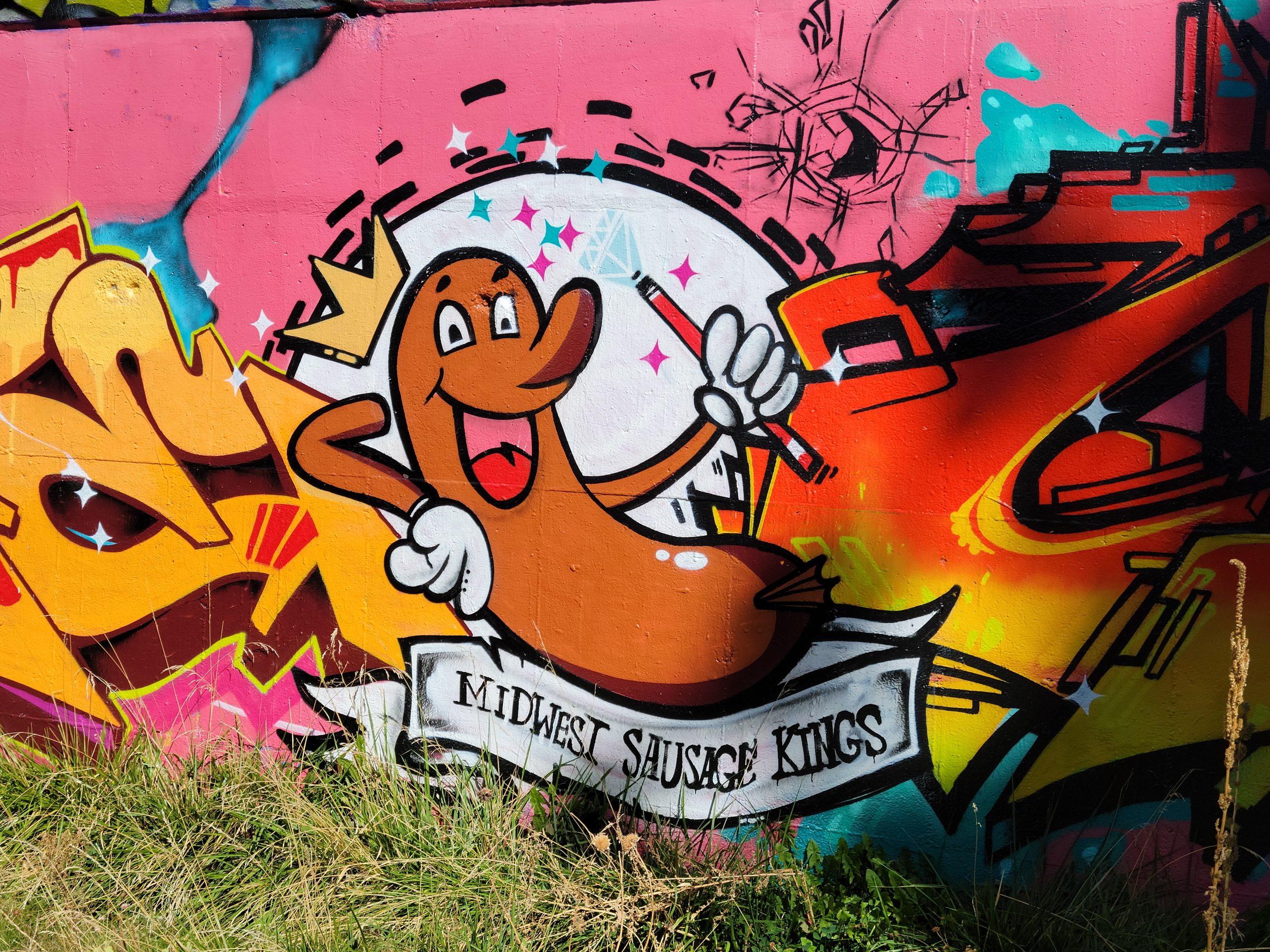 Painted on a bright pink concrete wall, this mural features a smiling sausage character with large, expressive eyes and a wide-open mouth. The character is depicted wearing a three-pointed gold crown and white cartoon-style gloves, holding a scepter that appears to be drawing a sparkling diamond surrounded by pink and teal stars. Below the character, a white flowing banner prominently displays the text "MIDWEST SAUSAGE KINGS". The artwork is surrounded by bold orange and yellow "wildstyle" graffiti lettering, showcasing the high-energy, collaborative nature of this urban art site.