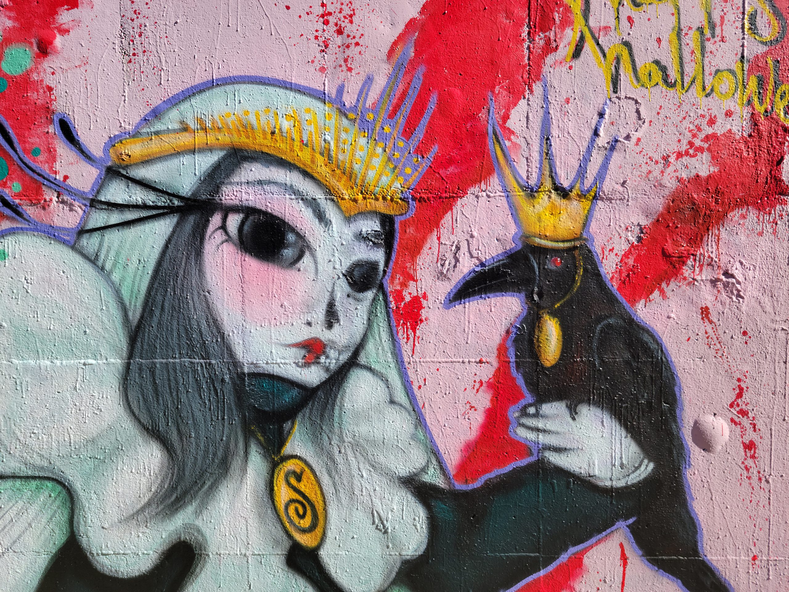 This tight shot focuses on the ethereal queen character, emphasizing her large, expressive dark eyes and the ornate gold crown perched on her head. A black crow, also wearing a gold crown and a medallion, sits perched on her hand. The background is a textured pink wall with energetic red spray-paint splatters, creating a sharp contrast with the character's pale skin and white ruffled collar. A gold "S" medallion hangs from her neck, and the flowing yellow script of a "Happy Halloween" message is partially visible in the corner.