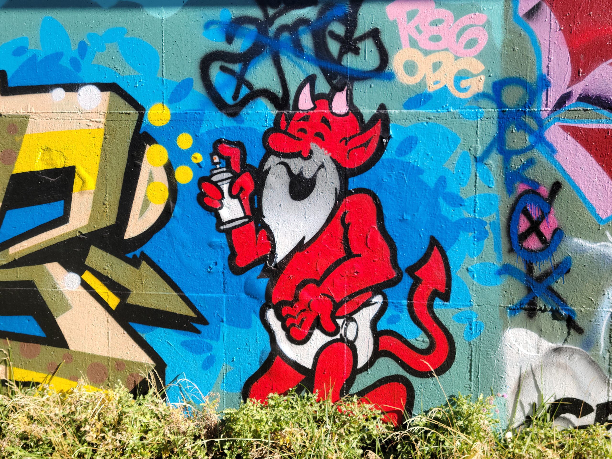 Painted on a textured concrete wall, this piece features a bright pink devil with a grumpy or devious facial expression. The character has large, pointed blue horns, gold hoop earrings, and a small skull-pendant necklace. It is depicted emerging from the top of a brown wooden barrel, with a large, pink clawed hand reaching out towards the right. The artwork is surrounded by other graffiti elements, including a bright yellow sunburst pattern and a sharp blue abstract shape to the left, highlighting the layered nature of this street art site.